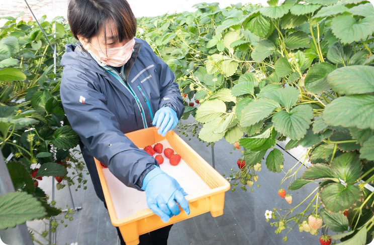 那須高原の冷涼な気候は、いちごやブルーベリー、りんごなどの栽培に適しており、寒暖差が大きいことで甘みが強くなります。さらに美味しく育てるため、剪定やつる返しなどの手間のかかる作業もおこなっています。